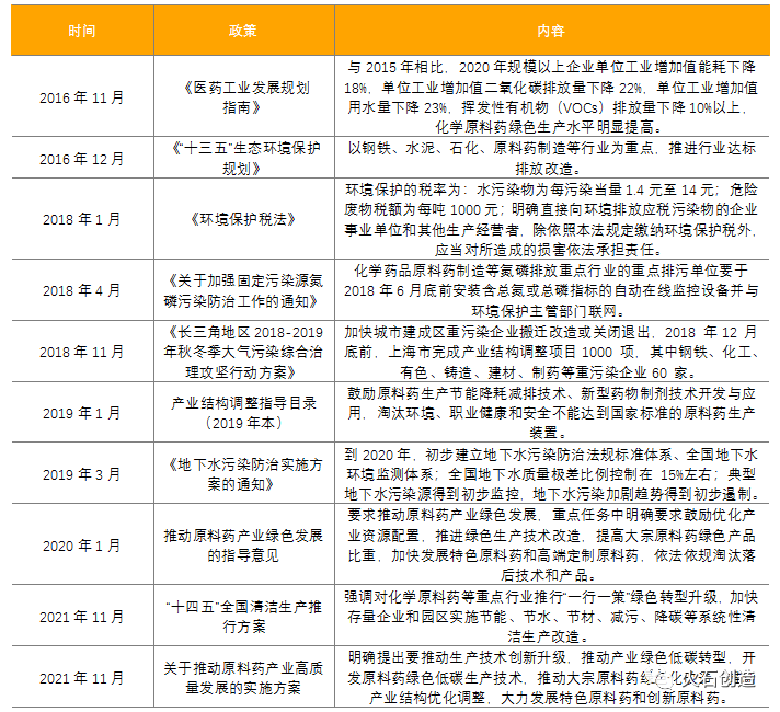 2016年至今环保部、生态环境部、工信部等多部委不断出台行业监管政策。化学原料药及中间体制造过程涉及大量化学反应及生物发酵,“三废”排放量大,在制药行业污染中占比较高,政策监管要求促使行业对环保的要求快速提升。